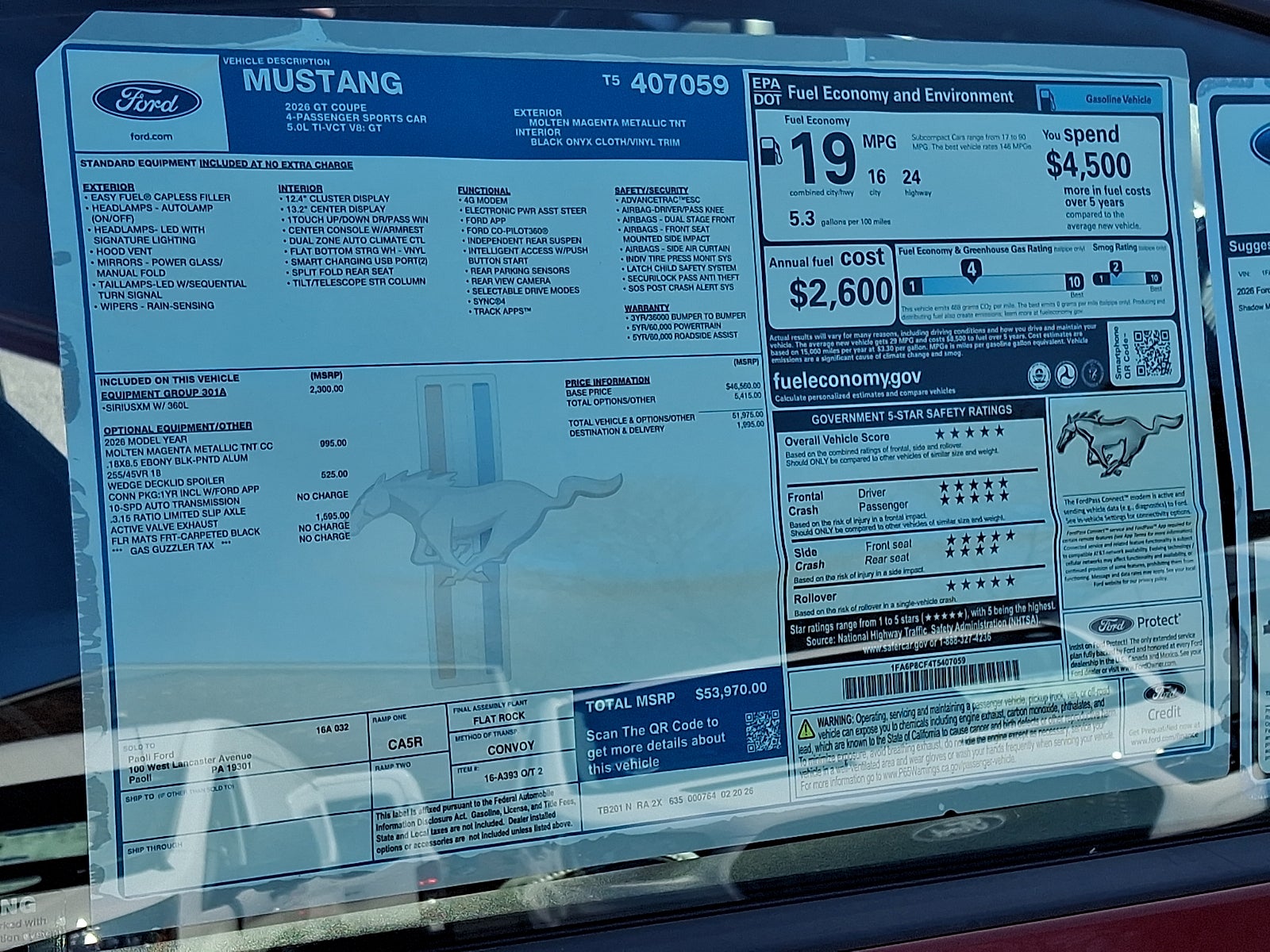 Paoli Ford is proud to present you with another great new Ford. This 2026 Ford Mustang is loaded with the following Factory Options:1st Row Carpeted Black Floor Mats, 4-Wheel Disc Brakes, ABS brakes, Active Valve Performance Exhaust, Air Conditioning, Alloy wheels, AM/FM Stereo, Auto High-beam Headlights, Automatic temperature control, Black Painted Wedge Decklid Spoiler, Brake assist, Bumpers: body-color, Cloth/Vinyl Heated Bucket Seats, Compass, Delay-off headlights, Driver door bin, Driver vanity mirror, Dual front impact airbags, Dual front side impact airbags, Electronic Stability Control, Emergency communication system: 911 Assist, Exterior Parking Camera Rear, Four wheel independent suspension, Front anti-roll bar, Front Bucket Seats, Front Center Armrest, Front dual zone A/C, Front reading lights, Fully automatic headlights, Illuminated entry, Knee airbag, Leather Shift Knob, Leather steering wheel, Low tire pressure warning, Occupant sensing airbag, Outside temperature display, Overhead airbag, Overhead console, Panic alarm, Passenger door bin, Passenger vanity mirror, Power door mirrors, Power steering, Power windows, Radio data system, Rain sensing wipers, Rear anti-roll bar, Rear Parking Sensors, Rear window defroster, RECARO Leather-Trimmed Sport Seats, Remote keyless entry, Speed control, Speed-sensing steering, Speed-Sensitive Wipers, Split folding rear seat, Sport steering wheel, Steering wheel mounted audio controls, SYNC 4, Tachometer, Telescoping steering wheel, Tilt steering wheel, Traction control, Trip computer, Variably intermittent wipers, Voltmeter, and Wedge Decklid Spoiler. Recent Arrival!